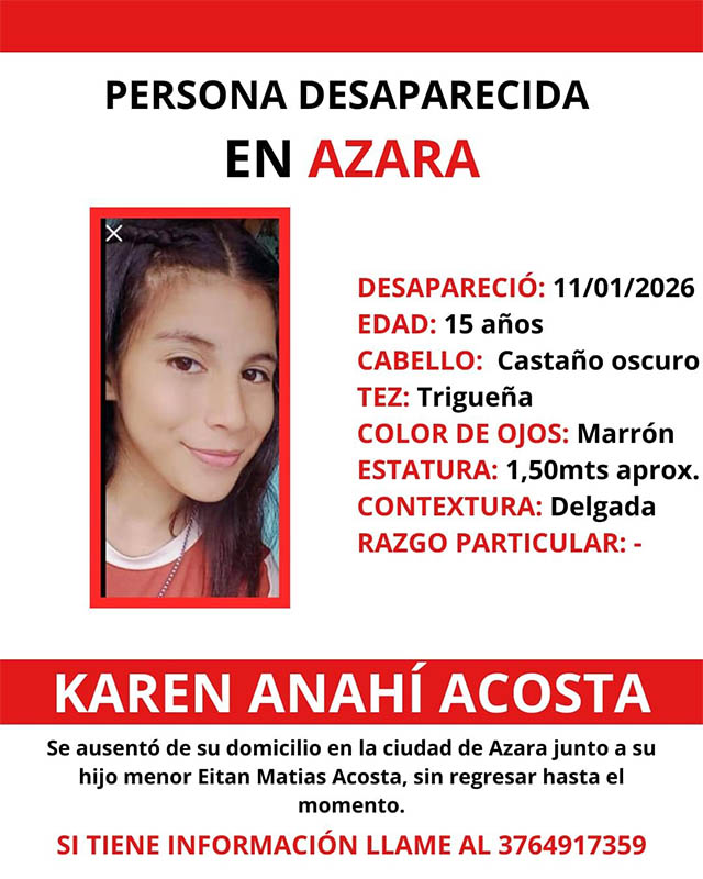 AGENCIAMISIONES.UNO | Azara. La Policía de Misiones pidió la colaboración de la comunidad para obtener información que permita localizar a una adolescente de 15 años y a su hijo, quienes se ausentaron de su domicilio.